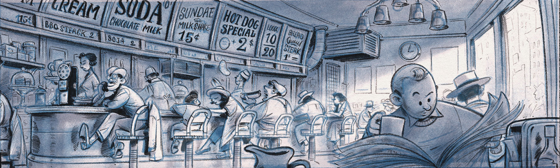 L’univers visuel allie décors urbains soignés, personnages hauts en couleur et mises en scène stylisées pour plonger le lecteur dans un Vieux New York empreint de polar vintage et de malice.